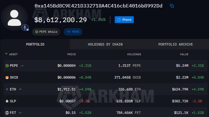 Meanwhile, $PEPE remains the dominant holding, with a valuation of $5.24 million. This composition underscores the whale’s continued appetite for select high-risk, high-reward investments.