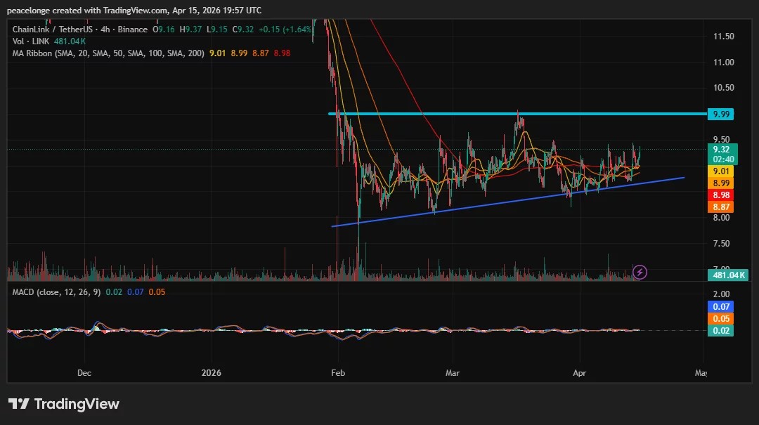 Chainlink price is at $9.32 on April 15, up 1.64% on the 4H session, after clearing all four SMAs simultaneously for the first time since the February decline, with the ribbon compressed into a $0.14 band before the breakout and the 4H MACD holding a positive crossover above the zero line.