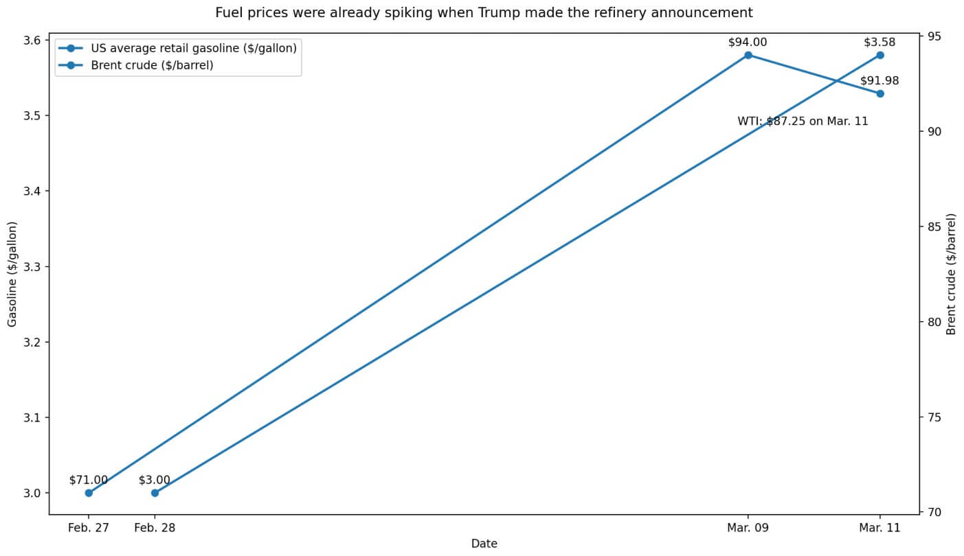 | Bear case | Hormuz disruption persists and gasoline stays above $3.50 | Project looks more like optics than relief | Little near-term consumer benefit; refinery timeline becomes a liability |