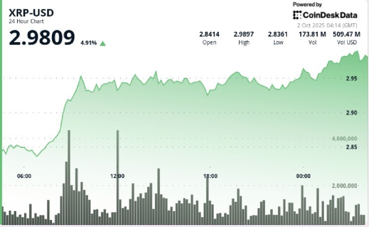 XRP climbed 5.2% over the 24-hour window from Oct. 1, 03:00 to Oct. 2, 02:00, advancing from $2.84 to $2.97. The move followed SBI’s launch of an XRP lending program for institutional payments, highlighting Japan’s push into large-scale adoption. The rally also comes as Ripple CTO David Schwartz transitions to an emeritus role and with seven spot ETF filings pending SEC decisions starting Oct. 18.