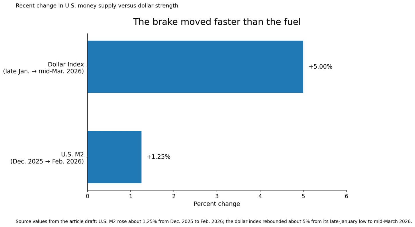 Over that same stretch, US M2 climbed about 1.25%. The brake moved roughly four times faster than the fuel.