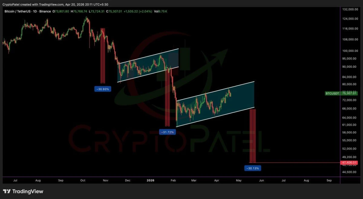 This chart shows a repeated Bitcoin pattern that Crypto Patel believes could lead to another sharp drop. The setup compares two earlier declines of about 31% with the current price structure. Now, the same rising channel appears to be forming again, and that is why traders are watching the lower trendline closely.