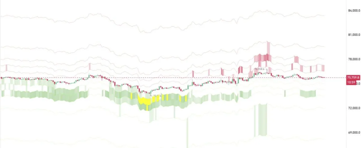 The heatmap also shows that recent liquidity clusters above and below price have shifted instead of staying firm. Earlier, buyers seemed more active in the lower zone around the mid $73,000 area. However, that support now looks less convincing. Meanwhile, some sell-side liquidity remains stacked higher, especially around the upper $76,000 to $78,000 range. So the market may be preparing for a volatility move toward those liquidity pockets.