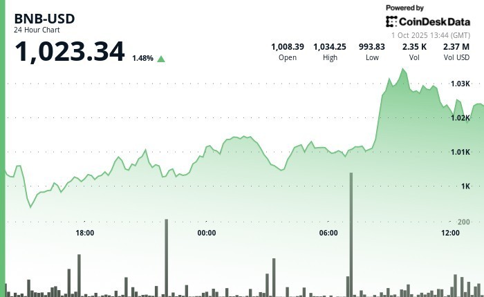 BNB’s 1% rise is relatively small compared to the broader cryptocurrency market’s. As measured by the CoinDesk 20 (CD20) index, the market rose 3.8% in the last 24 hours, after the U.S. government shutdown drove investors to alternative assets including BTC and gold.