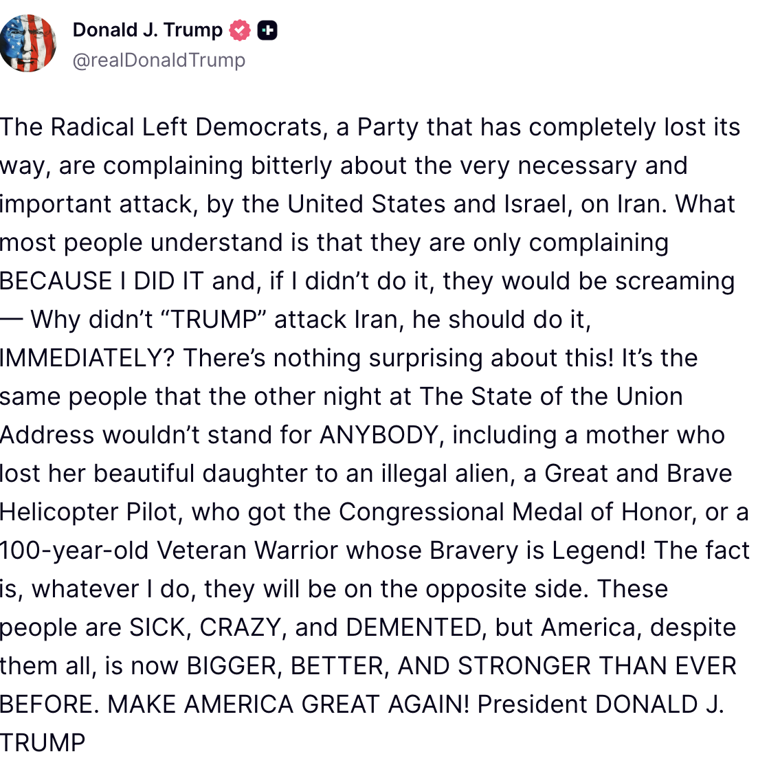 The rest of his post is a complaint about members of the Democratic Party performing a milquetoast protest during his State of the Union, wherein they didn’t stand during the proceedings.