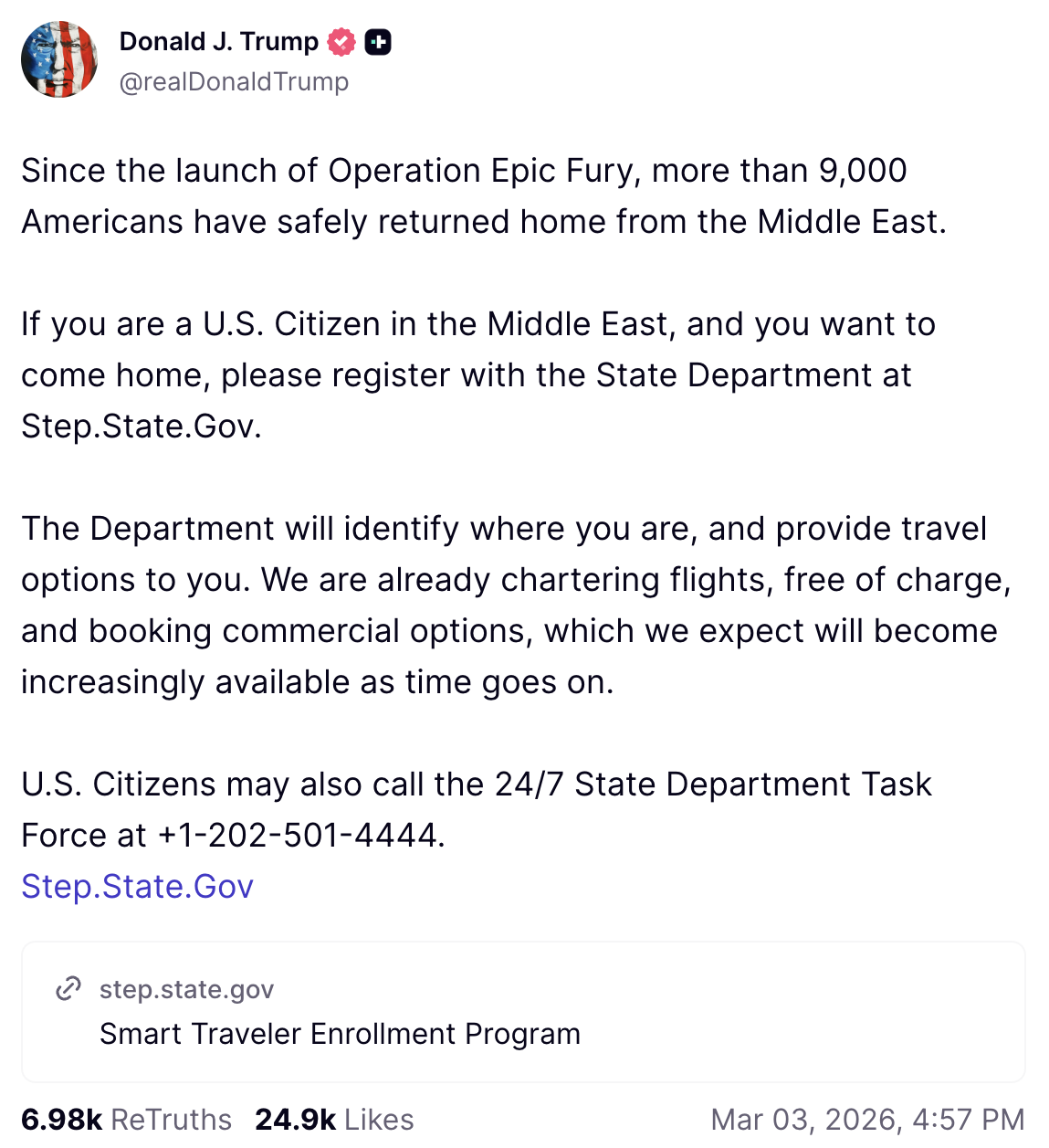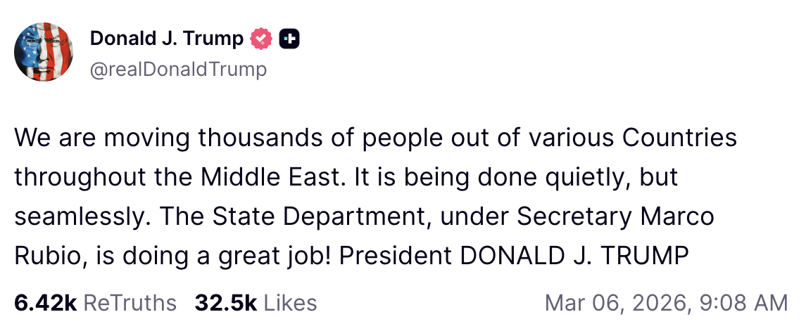 This post was followed by another in which Trump noted that “more than 9,000 Americans have safely returned home from the Middle East” and encouraged other people who might be endangered by the ongoing war to register with the State Department.