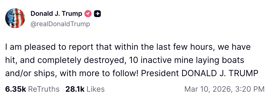 The second day of the war brought just one post from the president, in which he made the claim that “we have destroyed and sunk 9 Iranian Naval Ships, some of them relatively large and important.