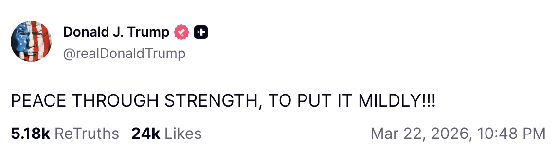 The next day, Trump added his thoughts about the progress of the war, claiming it was evidence of “PEACE THROUGH STRENGTH, TO PUT IT MILDLY!!!”
