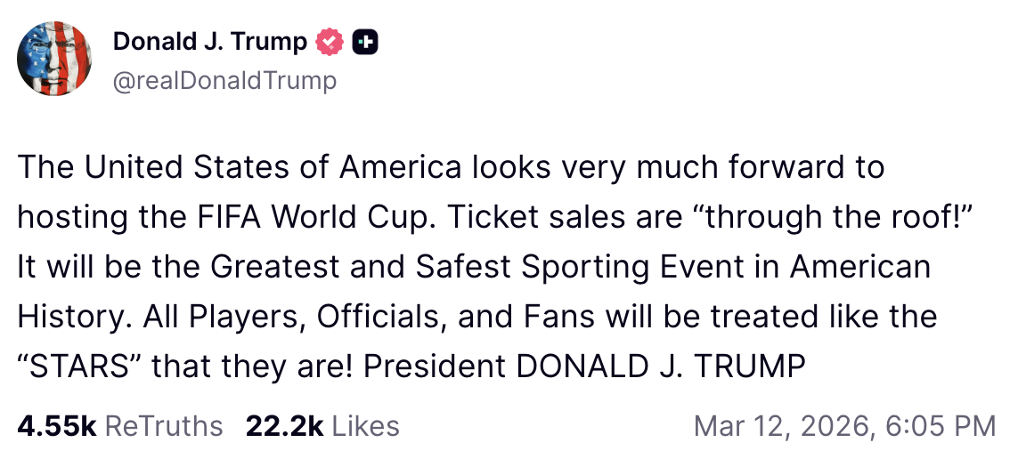 Trump warned that they’re welcome at the World Cup but noted that he doesn’t “believe it is appropriate that they be there, for their own life and safety.”