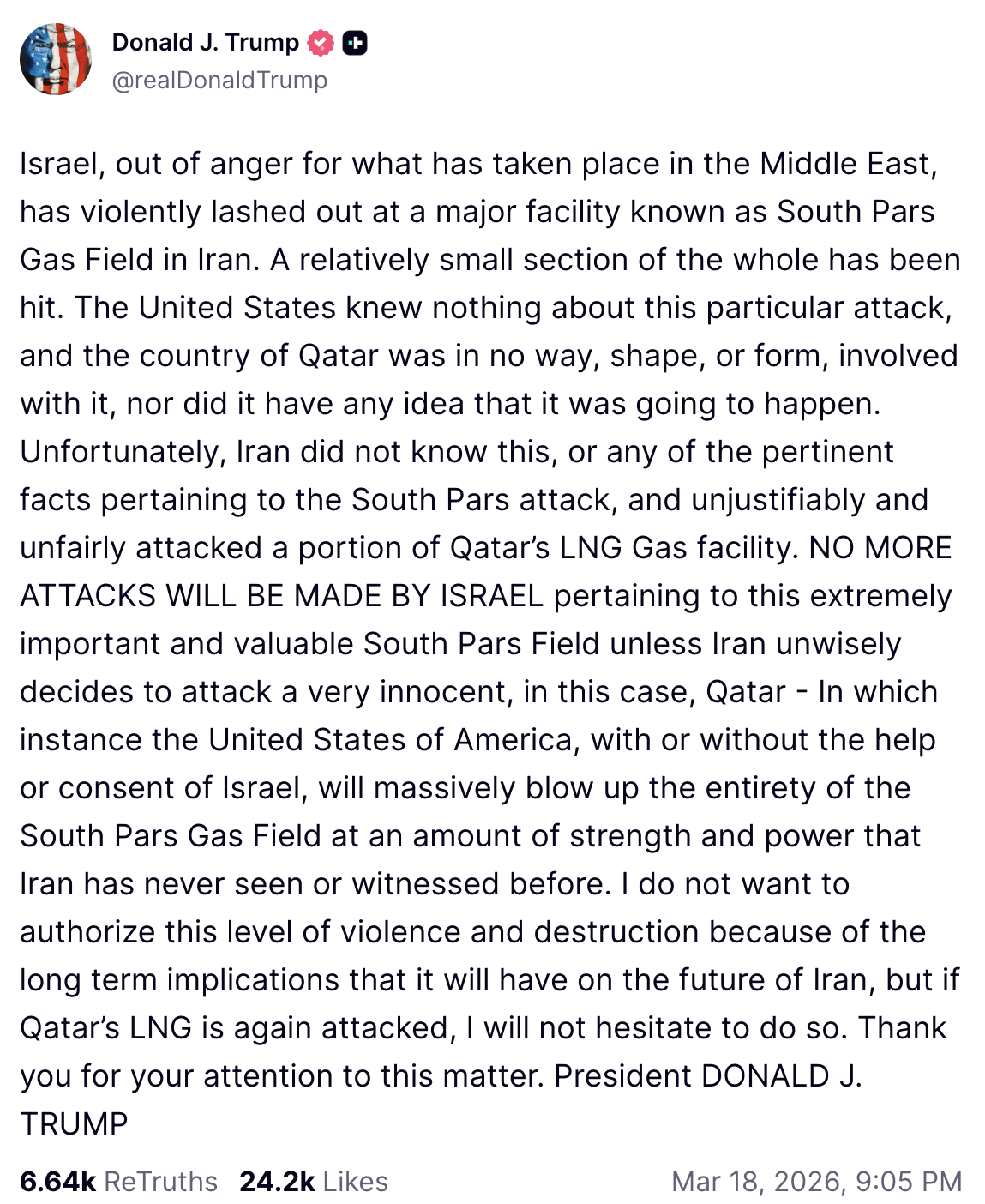 Trump added that “NO MORE ATTACKS WILL BE MADE BY ISRAEL pertaining to this extremely important and valuable South Pars Field unless Iran unwisely decides to attack a very innocent, in this case, Qatar – In which instance the United States of America, with or without the help or consent of Israel, will massively blow up the entirety of the South Pars Gas Field at an amount of strength and power that Iran has never seen or witnessed before.”