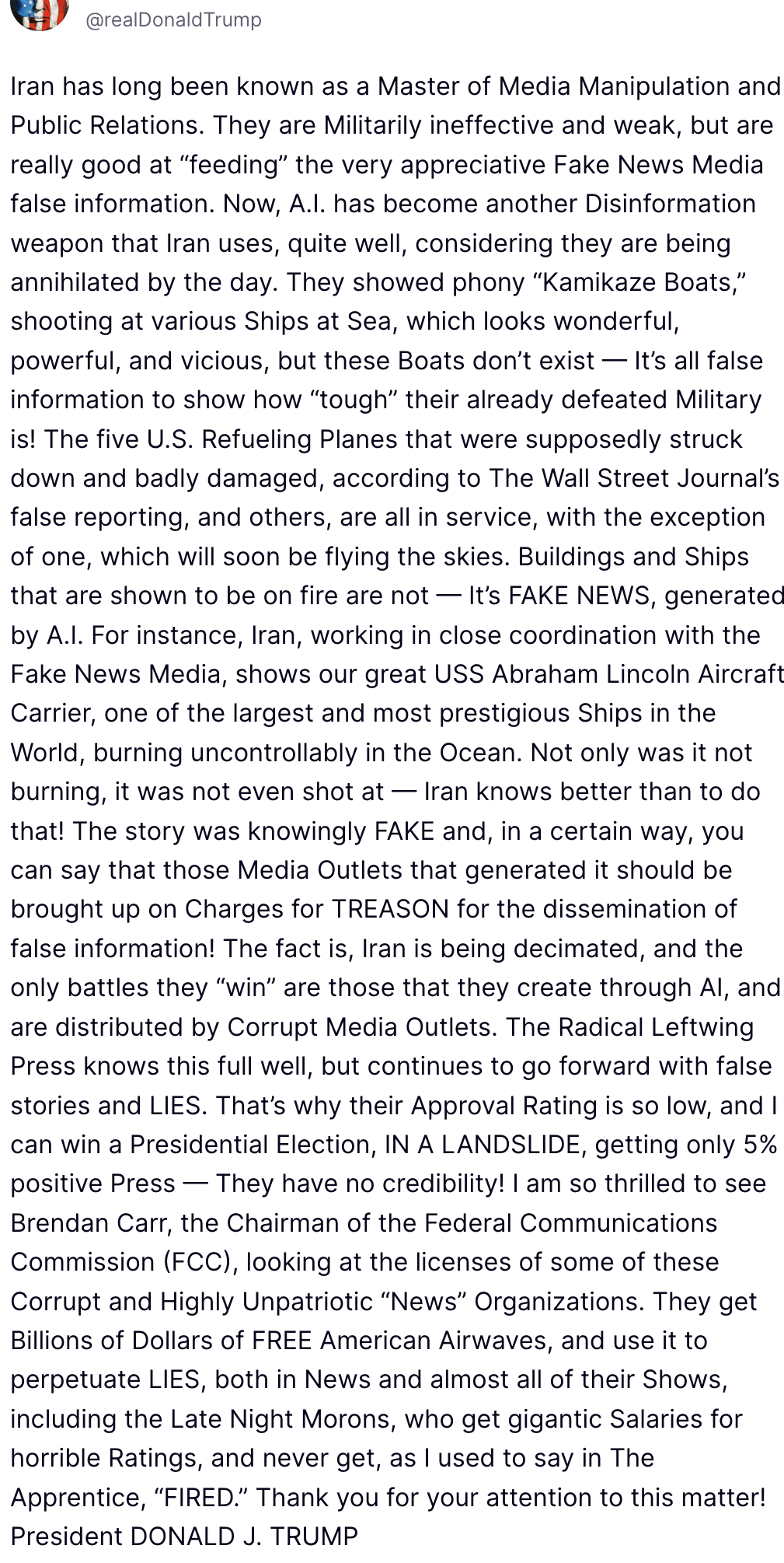 This was followed by the claim that Iran is using artificial intelligence to fool the media and that this might mean “that those Media Outlets that generated it should be brought up on Charges for TREASON for the dissemination of false information!”