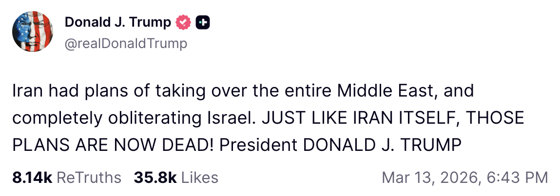 After this near acknowledgement that his war had endangered Americans, there were several days where Trump’s posts weren’t about the war he started.