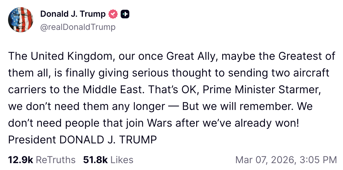 However, Trump then informed Prime Minister Keir Starmer that “we don’t need them any longer — But we will remember. We don’t need people that join Wars after we’ve already won!”