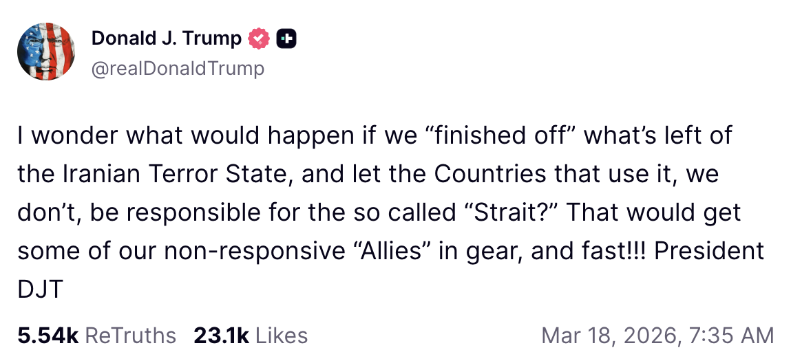 Trump returned to this topic again to share a New York Post opinion piece that claimed that “US allies need to get a grip — step up and help open the Strait of Hormuz.”