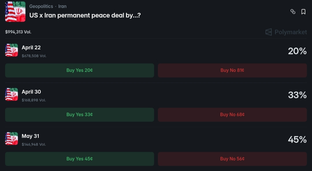 Home Crypto US-Iran War: Polymarket Odds for April Peace Deal Surge to 33% Bitcoin (BTC) $ 70,685.00 Ethereum (ETH) $ 2,188.98 Tether (USDT) $ 1.00 XRP (XRP) $ 1.32 BNB (BNB) $ 592.23 USDC (USDC) $ 0.999905 Solana (SOL) $ 81.54 TRON (TRX) $ 0.322407 Lido Staked Ether (STETH) $ 2,265.05 Figure Heloc (FIGR_HELOC) $ 1.04 Dogecoin (DOGE) $ 0.090781 USDS (USDS) $ 0.999829 WhiteBIT Coin (WBT) $ 51.91 Hyperliquid (HYPE) $ 40.57 LEO Token (LEO) $ 10.12 Wrapped stETH (WSTETH) $ 2,779.67 Cardano (ADA) $ 0.237260 Bitcoin Cash (BCH) $ 420.81 Wrapped Bitcoin (WBTC) $ 76,243.00 Chainlink (LINK) $ 8.74 Binance Bridged USDT (BNB Smart Chain) (BSC-USD) $ 0.998762 Monero (XMR) $ 336.76 Wrapped Beacon ETH (WBETH) $ 2,466.93 Zcash (ZEC) $ 359.07 Ethena USDe (USDE) $ 0.999847 Canton (CC) $ 0.144868 Wrapped eETH (WEETH) $ 2,465.31 Stellar (XLM) $ 0.150732 MemeCore (M) $ 2.83 sUSDS (SUSDS) $ 1.08 Dai (DAI) $ 0.999555 USD1 (USD1) $ 0.998726 Litecoin (LTC) $ 53.49 Coinbase Wrapped BTC (CBBTC) $ 76,366.00 PayPal USD (PYUSD) $ 0.999775 Avalanche (AVAX) $ 9.05 Rain (RAIN) $ 0.007937 WETH (WETH) $ 2,268.37 Hedera (HBAR) $ 0.085445 Toncoin (TON) $ 1.45 Sui (SUI) $ 0.902282 USDT0 (USDT0) $ 0.998824 Shiba Inu (SHIB) $ 0.000006 Cronos (CRO) $ 0.067981 Circle USYC (USYC) $ 1.12 Tether Gold (XAUT) $ 4,629.87 World Liberty Financial (WLFI) $ 0.078990 Bittensor (TAO) $ 259.87 BlackRock USD Institutional Digital Liquidity Fund (BUIDL) $ 1.00 Ethena Staked USDe (SUSDE) $ 1.22 PAX Gold (PAXG) $ 4,636.49 Mantle (MNT) $ 0.664006 Global Dollar (USDG) $ 0.999876 Polkadot (DOT) $ 1.23 Uniswap (UNI) $ 3.01 Falcon USD (USDF) $ 0.997773 NEAR Protocol (NEAR) $ 1.35 OKB (OKB) $ 82.42 Sky (SKY) $ 0.073369 Pi Network (PI) $ 0.166805 Little Pepe (LILPEPE) $ 2.16 HTX DAO (HTX) $ 0.000002 Aster (ASTER) $ 0.659513 syrupUSDC (SYRUPUSDC) $ 1.15 USDD (USDD) $ 0.999872 Pepe (PEPE) $ 0.000003 Ripple USD (RLUSD) $ 1.00 RaveDAO (RAVE) $ 5.49 Aave (AAVE) $ 89.65 Janus Henderson Anemoy Treasury Fund (JTRSY) $ 1.10 Bitget Token (BGB) $ 1.91 Ondo US Dollar Yield (USDY) $ 1.13 Internet Computer (ICP) $ 2.42 BFUSD (BFUSD) $ 0.999810 Ethereum Classic (ETC) $ 8.15 Ondo (ONDO) $ 0.242285 Gate (GT) $ 6.60 KuCoin (KCS) $ 8.28 Jupiter Perpetuals Liquidity Provider Token (JLP) $ 4.00 Quant (QNT) $ 74.95 Pump.fun (PUMP) $ 0.001778 Render (RENDER) $ 1.88 Worldcoin (WLD) $ 0.286447 Morpho (MORPHO) $ 1.68 Jito Staked SOL (JITOSOL) $ 124.46 Spiko EU T-Bills Money Market Fund (EUTBL) $ 1.22 Algorand (ALGO) $ 0.102440 Kelp DAO Restaked ETH (RSETH) $ 2,404.69 Cosmos Hub (ATOM) $ 1.73 Kaspa (KAS) $ 0.031652 Binance-Peg WETH (WETH) $ 2,262.26 POL (ex-MATIC) (POL) $ 0.081508 Rocket Pool ETH (RETH) $ 2,631.35 USDtb (USDTB) $ 0.999317 NEXO (NEXO) $ 0.861516 Binance Bridged USDC (BNB Smart Chain) (USDC) $ 0.999945 Superstate Short Duration U.S. Government Securities Fund (USTB) (USTB) $ 11.05 Ethena (ENA) $ 0.091179 Wrapped BNB (WBNB) $ 759.61 Blockchain Capital (BCAP) $ 83.06 Function FBTC (FBTC) $ 76,389.00 JUST (JST) $ 0.081984 OUSG (OUSG) $ 114.87 Arbitrum (ARB) $ 0.110921 Filecoin (FIL) $ 0.860359 Flare (FLR) $ 0.007724 syrupUSDT (SYRUPUSDT) $ 1.11 Official Trump (TRUMP) $ 2.80 Aptos (APT) $ 0.809740 Midnight (NIGHT) $ 0.038046 Binance Staked SOL (BNSOL) $ 108.24 Provenance Blockchain (HASH) $ 0.011164 Beldex (BDX) $ 0.080124 YLDS (YLDS) $ 0.999951 XDC Network (XDC) $ 0.029899 GHO (GHO) $ 0.999382 VeChain (VET) $ 0.006752 NEW X CEO IS BACK (XFLOKI) $ 0.506041 Polygon Bridged USDC (Polygon PoS) (USDC.E) $ 0.999720 Jupiter (JUP) $ 0.160063 Solv Protocol BTC (SOLVBTC) $ 76,461.00 Siren (SIREN) $ 0.783717 Lombard Staked BTC (LBTC) $ 76,491.00 Usual USD (USD0) $ 0.998542 Stable (STABLE) $ 0.025135 Artificial Superintelligence Alliance (FET) $ 0.230810 clBTC (CLBTC) $ 76,920.00 Dash (DASH) $ 40.97 Bonk (BONK) $ 0.000006 TrueUSD (TUSD) $ 0.999272 LayerZero (ZRO) $ 1.92 A7A5 (A7A5) $ 0.012378 PancakeSwap (CAKE) $ 1.46 StakeWise Staked ETH (OSETH) $ 2,419.84 DeXe (DEXE) $ 9.88 ADI (ADI) $ 4.33 Kinetiq Staked HYPE (KHYPE) $ 33.97 tBTC (TBTC) $ 70,942.00 Virtuals Protocol (VIRTUAL) $ 0.644553 EURC (EURC) $ 1.17 WrappedM by M0 (WM) $ 1.00 Pudgy Penguins (PENGU) $ 0.006439 Janus Henderson Anemoy AAA CLO Fund (JAAA) $ 1.03 First Digital USD (FDUSD) $ 1.00 Stacks (STX) $ 0.211822 Kinesis Gold (KAU) $ 159.33 c8ntinuum (CTM) $ 0.087592 Chiliz (CHZ) $ 0.036431 Tezos (XTZ) $ 0.341666 Mantle Staked Ether (METH) $ 2,455.82 Decred (DCR) $ 21.12 USX (USX) $ 0.999742 Polygon PoS Bridged DAI (Polygon POS) (DAI) $ 0.999983 Venice Token (VVV) $ 7.93 Resolv wstUSR (WSTUSR) $ 1.13 Sei (SEI) $ 0.053525 COCA (COCA) $ 1.30 PRIME (PRIME) $ 1.03 Monad (MON) $ 0.032821 Sun Token (SUN) $ 0.018506 Doge Strategy (DOGESTR) $ 0.288297 Liquid Staked ETH (LSETH) $ 2,406.26 Aerodrome Finance (AERO) $ 0.358008 Arbitrum Bridged WBTC (Arbitrum One) (WBTC) $ 76,200.00 AINFT (NFT) $ 0.00000033 Ether.fi (ETHFI) $ 0.413316 BitTorrent (BTT) $ 0.00000033 edgeX (EDGE) $ 0.894918 Wrapped Flare (WFLR) $ 0.009961 Curve DAO (CRV) $ 0.209027 Gnosis (GNO) $ 117.31 L2 Standard Bridged WETH (Base) (WETH) $ 2,266.86 Bitcoin SV (BSV) $ 15.28 Steakhouse USDC Morpho Vault (STEAKUSDC) $ 1.12 Plasma (XPL) $ 0.124438 USDai (USDAI) $ 0.999992 Injective (INJ) $ 2.89 SPX6900 (SPX) $ 0.298097 Kinesis Silver (KAG) $ 73.52 Binance-Peg XRP (XRP) $ 1.59 Legacy Frax Dollar (FRAX) $ 0.993364 Ether.Fi Liquid ETH (LIQUIDETH) $ 2,443.47 Kaia (KAIA) $ 0.046647 Renzo Restaked ETH (EZETH) $ 2,421.84 Ape and Pepe (APEPE) $ 0.000001 Lighter (LIT) $ 1.08 Noon (NOON) $ 0.751949 sBTC (SBTC) $ 77,039.00 Conflux (CFX) $ 0.051349 FLOKI (FLOKI) $ 0.000028 Lido DAO (LDO) $ 0.312962 Jupiter Staked SOL (JUPSOL) $ 115.56 DoubleZero (2Z) $ 0.076258 Savings USDD (SUSDD) $ 1.03 Official FO (FO) $ 0.265962 Celestia (TIA) $ 0.292037 Maple Finance (SYRUP) $ 0.226337 Marinade Staked SOL (MSOL) $ 133.18 JasmyCoin (JASMY) $ 0.005235 Arbitrum Bridged WETH (Arbitrum One) (WETH) $ 2,265.06