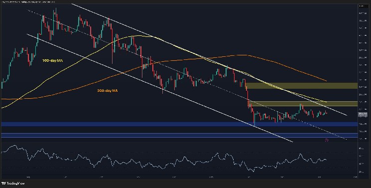 A decisive break above $2.4k would invalidate the sequence of lower highs and potentially shift the structure toward a bullish reversal, as it would also mean a break above both the descending channel’s higher boundary and the 100-day moving average. Conversely, losing the $1.8k demand zone would likely trigger a breakdown from the range and open the door for a deeper move toward the next support level at $1.6k.